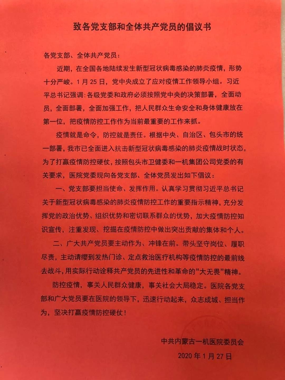 1月27日,中國兵器工業(yè)集團一機集團醫(yī)院院黨委向全院黨員發(fā)出號召,號召黨員帶頭組建“醫(yī)護突擊隊”,作為預備力量,隨時準備投入到抗擊疫情的第一線。內蒙古一機醫(yī)院內系黨支部、外系黨支部、門診黨支部、藥放化黨支部、口腔黨支部、機關第一黨支部、機關第二黨支部等7個黨支部的黨員和群眾均積極請纓,要求加入到抗擊疫情的一線。一張張按著紅手印的請戰(zhàn)書紛紛發(fā)到內蒙古一機醫(yī)院先鋒黨員群,有的以個人名義請戰(zhàn),有的以支部名義請戰(zhàn)。