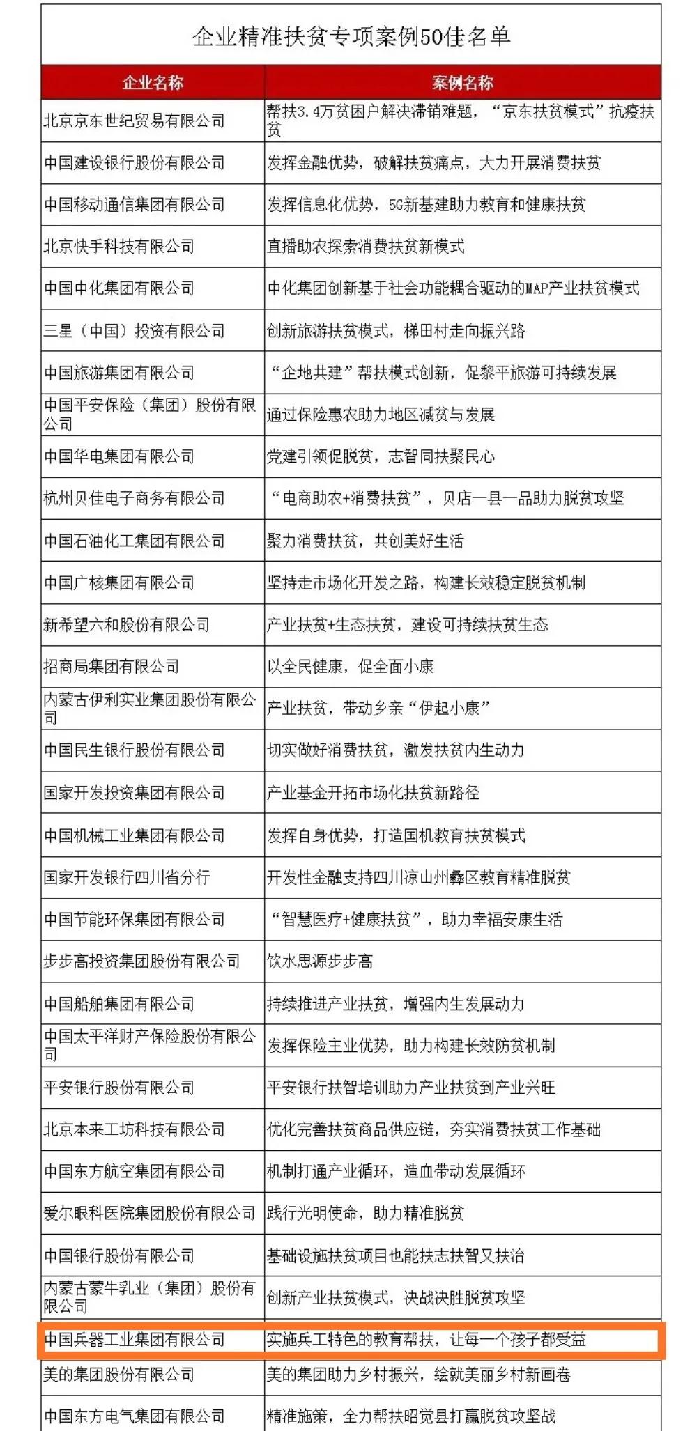 兵器工業(yè)集團(tuán)教育扶貧獲評國務(wù)院扶貧辦2020年企業(yè)精準(zhǔn)扶貧專項案例“50佳” |