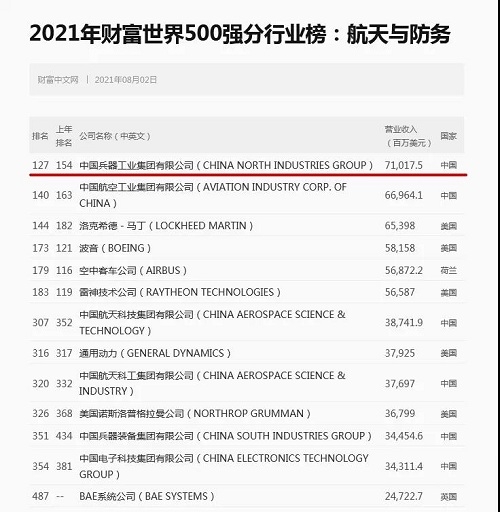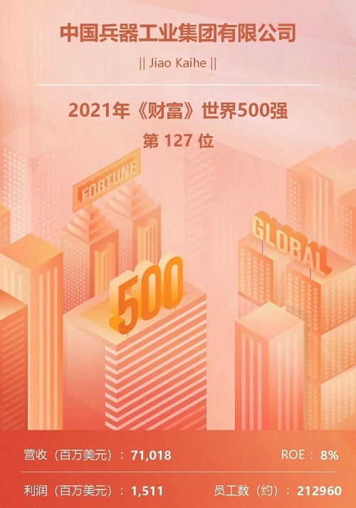 兵器工業(yè)集團(tuán)位列2021年世界500強(qiáng)第127位