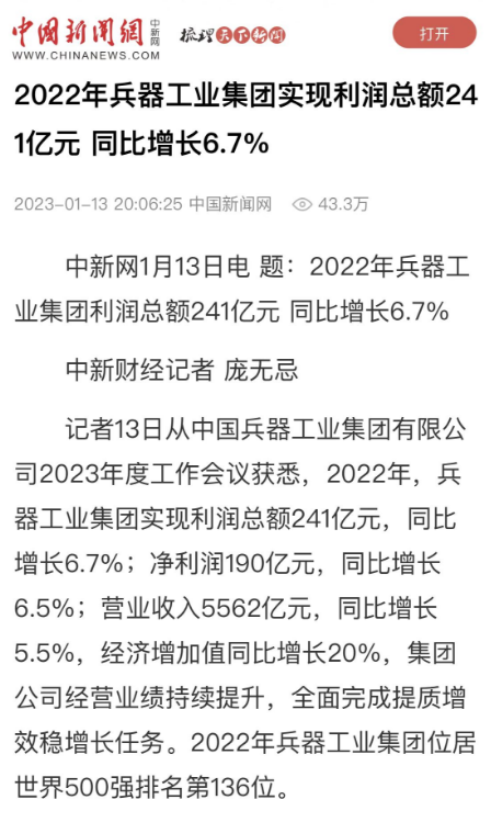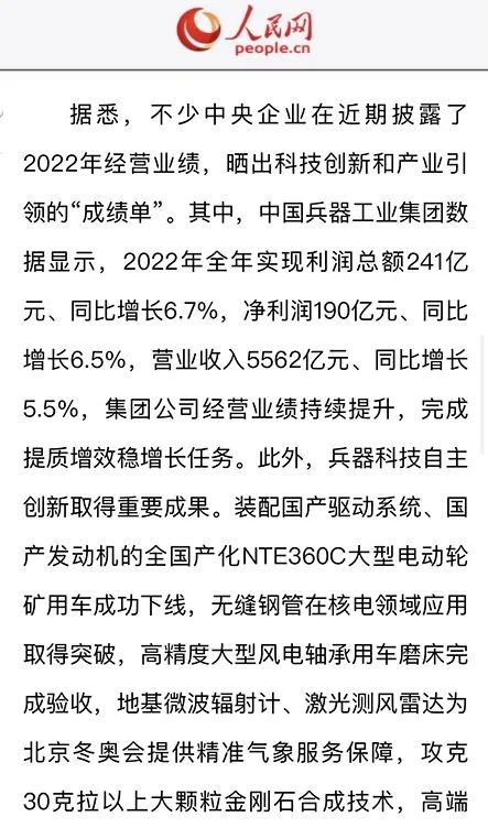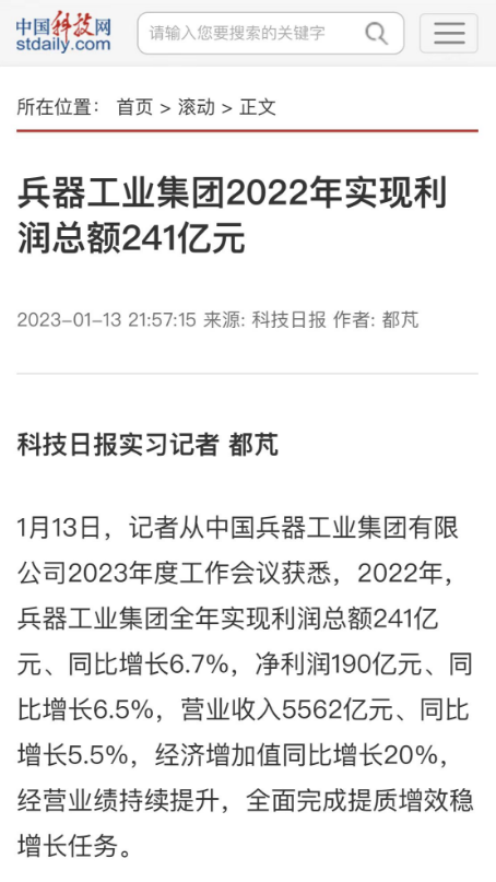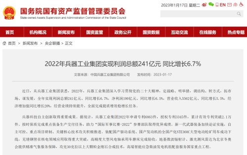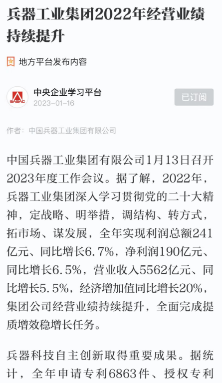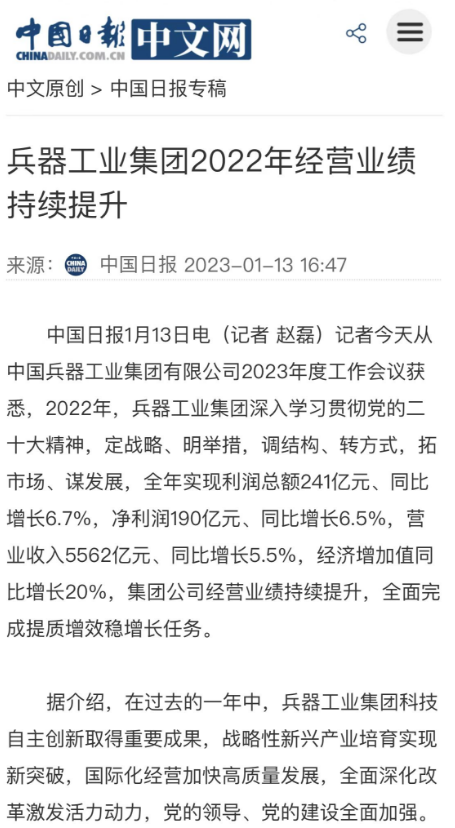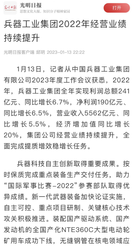 1月13日,中國兵器工業(yè)集團有限公司召開2023年度工作會議,傳達學習中央領導同志、軍方首長和上級部門重要批示,總結集團公司2022年工作,研究部署2023年主要工作任務。 集團公司2022年重點工作取得的成績及下一步的改革發(fā)展受到社會媒體廣泛關注。新華社、新華財經、人民網、經濟日報客戶端、光明日報客戶端、中國日報網、中國科技網、中國新聞網、央廣網、國資委網站、學習強國中央企業(yè)學習平臺、新浪網、騰訊網、搜狐網、網易網、今日頭條等中央主流媒體、國家部委網站及知名網絡媒體對集團公司工作會議進行了報道,重點關注集團公司高質量發(fā)展、科技創(chuàng)新、戰(zhàn)略性新興產業(yè)培育、深化改革、國際化經營、履行央企社會責任等內容。其中新華社以《北斗時空智能服務平臺累計服務終端數(shù)突破15億》為題,重點報道了集團公司2022年在自主創(chuàng)新、戰(zhàn)略新興產業(yè)培育、專利申請等方面取得的成績;經濟日報客戶端、光明日報客戶端、中國日報網等以《兵器工業(yè)集團2022年經營業(yè)績持續(xù)提升》為題,重點報道了集團公司在高質量發(fā)展、全面完成提質增效穩(wěn)增長方面取得的成績。集團公司門戶網站、微信公眾號、微博等新媒體也對集團公司工作會議進行了及時報道,各成員單位紛紛對相關內容進行轉載,引發(fā)全系統(tǒng)關注。 新華社:北斗時空智能服務平臺累計服務終端數(shù)突破15億 新華財經:兵器工業(yè)集團2022年實現(xiàn)凈利潤190億元 同比增長6.5% 人民網:2022年中央企業(yè)營收同比增長8.3% 科技創(chuàng)新成效顯著 經濟日報客戶端:兵器工業(yè)集團2022年經營業(yè)績持續(xù)提升 光明日報客戶端:兵器工業(yè)集團2022年經營業(yè)績持續(xù)提升 中國日報網:兵器工業(yè)集團2022年經營業(yè)績持續(xù)提升 中國科技網:兵器工業(yè)集團2022年實現(xiàn)利潤總額241億元 中國新聞網:2022年兵器工業(yè)集團實現(xiàn)利潤總額241億元 同比增長6.7% 國資委網站:2022年兵器工業(yè)集團實現(xiàn)利潤總額241億元 同比增長6.7% 學習強國中央企業(yè)學習平臺:兵器工業(yè)集團2022年經營業(yè)績持續(xù)提升 集團公司職工及廣大網友熱議工作會議 “這次會議全面總結了2022年工作,深入分析研判當前形勢,部署2023年重點工作,為我們做好2023年及今后一個時期的工作明確了目標、堅定了信心?!?/p> “作為兵工人,我要苦練內功、不懼挑戰(zhàn)、奮勇向前,為建設具有全球競爭力的世界一流集團公司貢獻自己的力量?!?/p> “聚焦高科技領域,制造更多的大國重器,讓更多的產品服務老百姓?!?/p> “在不平凡的2022年取得了亮眼的工作成績,為兵器工業(yè)點贊?!?/p> “希望能有更多新型武器裝備部隊,2023年,望你們再創(chuàng)輝煌,加油!” |