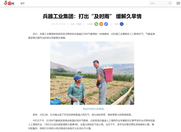 5月27日,中國網(wǎng)刊發(fā)《兵器工業(yè)集團(tuán):打出“及時雨” 緩解久旱情》,對中國兵器工業(yè)集團(tuán)有限公司助力云南省紅河州人工影響天氣、氣象監(jiān)測建設(shè)等方面作出的突出貢獻(xiàn)作了報道。