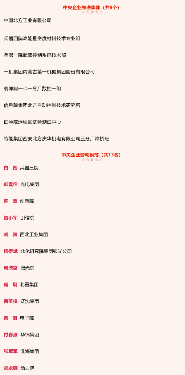 近日,人力資源社會(huì)保障部、國(guó)務(wù)院國(guó)資委發(fā)布《關(guān)于表彰中央企業(yè)先進(jìn)集體和勞動(dòng)模范的決定》并召開(kāi)表彰大會(huì),中國(guó)兵器工業(yè)集團(tuán)有限公司8個(gè)集體榮獲“中央企業(yè)先進(jìn)集體”稱號(hào),13名個(gè)人榮獲“中央企業(yè)勞動(dòng)模范”稱號(hào)。